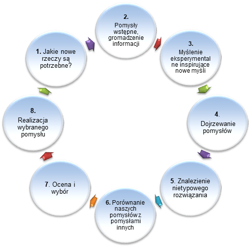 Faza pierwsza to przygotowanie, podczas którego gromadzone są informacje i dane. Warunkiem stworzenia czegoś nowego jest zrozumienie i poznanie starego. Druga faza to burza mózgów, która służy zbieraniu i organizowaniu pomysłów. Trzecią fazą jest inkubacja, która sprzyja nowemu postrzeganiu pomysłów i pozwala spojrzeć na nie pod innym kątem. Narodzą się nowe, niezwykłe pomysły, którym towarzyszyć może doświadczenie typu „eureka”. Podczas ostatniej fazy należy wybrać te pomysły, które chcemy wcielić w życie i rozwinąć w bardziej złożone rozwiązania. Proces ten został opisany przez model Uccello.